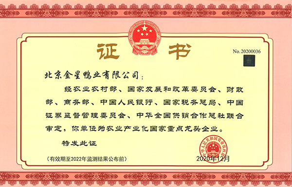 经过二十余年的发展,北京金星鸭业有限公司的社会影响力愈来愈高,通过了ISO9001质量管理体系、ISO22000食品安全管理体系、ISO14000环境体系等认证,并获得了北京市模范集体、国家科学技术进步二等奖、北京市科技进步一等奖、全国农业标准化示范农场、北京市农业产业化重点龙头企业、农业产业化国家重点龙头企业、国家高新技术企业、北京鸭地理标志产品首家授权使用单位等多项荣誉。