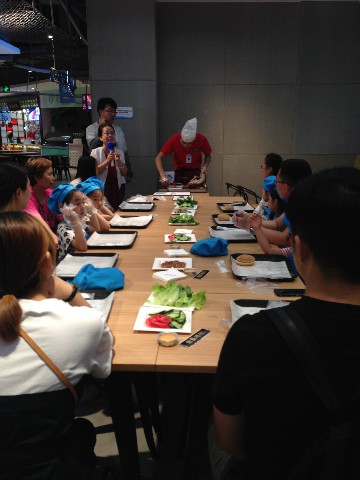 小朋友们在片鸭师的现场指导以及爸爸妈妈的协助下,亲自动手,做金星烤鸭汉堡。烤鸭汉堡制作完成后,小朋友们还意犹未尽,在工作人员的带领下,参观了金星烤鸭店,进一步了解烤鸭文化,并合影留念。